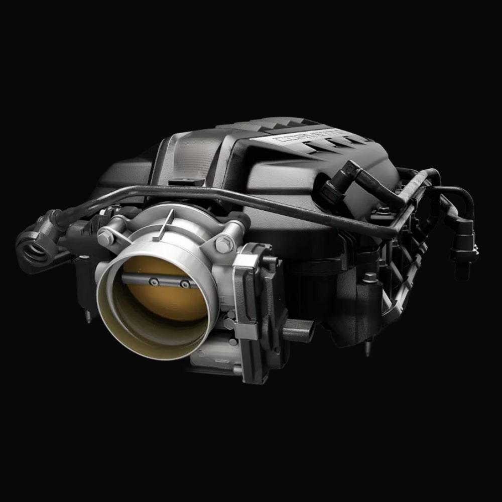 El colector de admisión tiene 8 conductores de la misma longitud con 210mm para maximizar el torque y flujo de aire para cada cilindro. Este ensamble también usa un cuerpo de aceleración de 87mm.